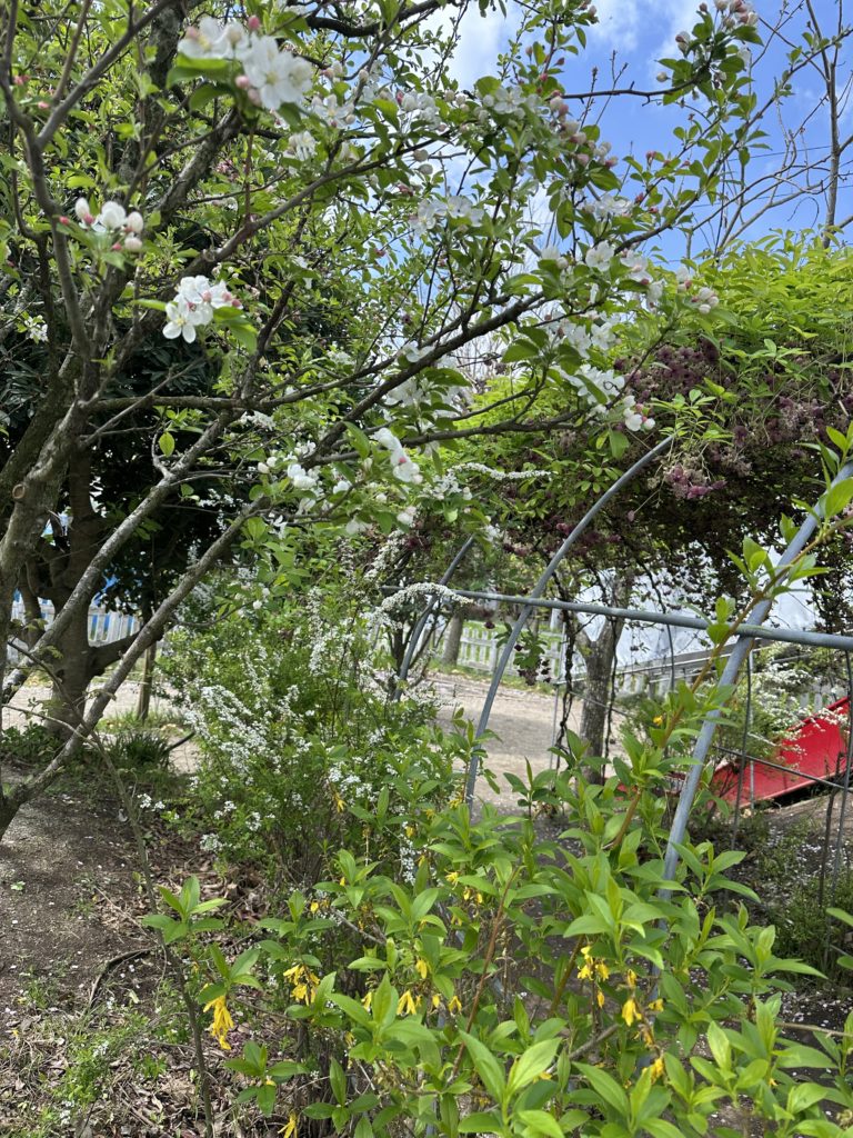 ヒメリンゴが白い花を咲かせている隣には、レンギョウが黄色い花を咲かせて、お庭は花ざかり🌼