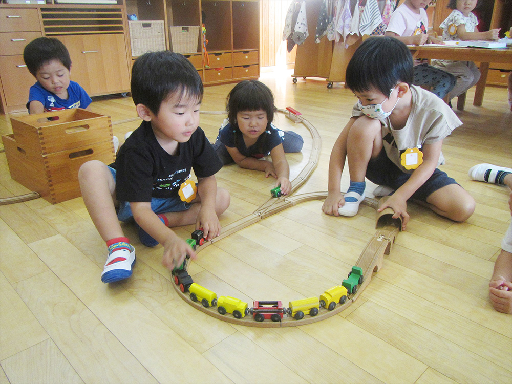 場所や人数もさまざまですが“夢中で遊ぶこと”を大事にして、いろいろなことを学べるようにします。先生は見守りながらサポートしていきます。